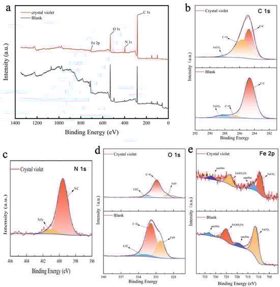 Figure 7 presents the XPS spectra of the sample after immersion in the CO2-saturated 5% NaCl corrosion without or with 100 ppm CV at 40 °C for 72 h. The full spectrum of XPS (Figure 7a) indicates the presence of C, O, N, and Fe elements. The elements of C, O, and Fe are present as expected; however, an increased amount of N is attributed to CV adsorbed on the surface of the sample. The high-resolution XPS spectra for C 1s, N 1s, O 1s, and Fe 2p, as well as the bonding configurations for each peak, are displayed in Figure 7b–e. The C 1s spectrum (Figure 7b) can be deconvoluted into peaks at 284.7, 286.6, and 288.2 eV, corresponding to C-C, C=O, and FeCO3, respectively [40]. For the N 1s spectrum (Figure 7c), the peak at 399.1 eV is attributed to the C-N in the corrosion inhibitor molecule, while the peak at 399.9 eV corresponds to N-Fe [41,42]. The O 1s spectrum features three peaks at 530.2, 531.9, and 532.7 eV, which are assigned to FeO, C=O, and CO32−, respectively [43,44]. In the Fe 2p spectrum, two typical Fe2p1/2 and Fe 2p3/2 peaks are observed at binding energies of 725.0 eV and 709.3 eV, respectively. According to previous studies referenced in the literature [40,45,46], the peak located at 709.3 eV of Fe 2p3/2 is assigned to FeCO3. Additionally, satellite features associated with iron are present at binding energies of 719.1 eV and 733.2 eV. Furthermore, the Fe2p1/2 spectral feature at 725.0 eV is associated with the presence of FeO(H2O) [47]. Therefore, the XPS analysis confirms that CV has been successfully adsorbed onto the carbon steel surface.
