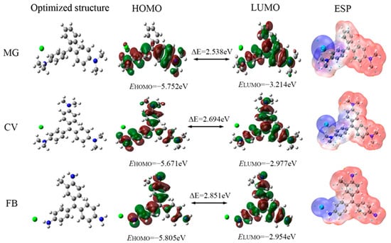 Figure 9 presents optimized molecular structures of the inhibitors and their LUMO and HOMO distribution. HOMO and LUMO can determine the capacity of the molecule to accept electrons and provide electrons, respectively. The HOMO and LUMO distribution of three dyes are similar and around the benzene ring and N atoms, indicating that these structures can provide electrons to Fe atoms and can accept electrons from the Fe atoms. In addition, the values of EHOMO, E LUMO, and ΔE for MG, MV, and FB are shown in Figure 9. Typically, a higher EHOMO value indicates more reactive electrons within the bonding orbitals and an enhanced capability of the corrosion inhibitor molecules to donate electron pairs. Conversely, a smaller ELUMO value signifies a reduction in the system’s energy following the transfer of electron pairs to the bonding orbitals, facilitating the acceptance of electrons by the corrosion inhibitor [50]. The highest EHOMO (−5.671 eV) of CV surpasses those of MG and FB, which are −5.752 eV and −5.805 eV, respectively, signifying a superior electron-donating characteristic for CV. Furthermore, the ELUMO of MG at −3.214 eV is lower than that of CV at −2.977 eV and FB at −2.945 eV, indicating that MG possesses a more pronounced electron-accepting capability. It is clear that all dye molecules have positive ΔE values, which suggests that triphenylmethane dyes could donate π–electrons or lone pair electrons to the iron atoms. The smallest energy gap ΔE of MG indicates that it forms chemical bonds more easily in the adsorption process [40].