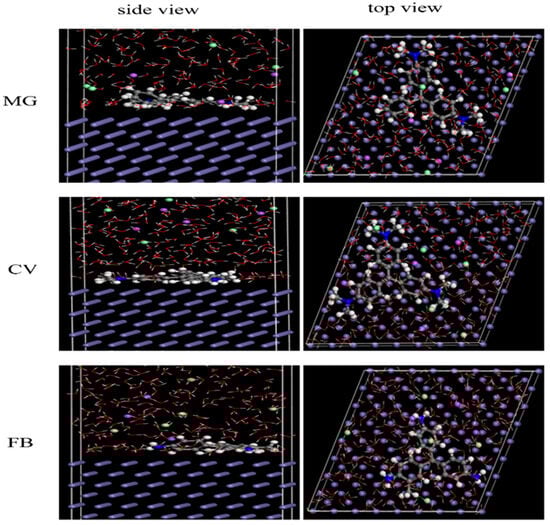 The interaction between the dye molecules and Fe surface is demonstrated by the MD simulation to further clarify the adsorption mechanism. Figure 10 shows the side and top views of dye adsorption configurations on the Fe (110)/H2O interface system. From Figure 10, dyes are adsorbed onto the metal surface in place of water, which creates a barrier to prevent corrosion. All dyes are absorbed almost parallel to the surface of Fe from the top view. According to Mulliken charges, electrons of the dye molecules’ N atom and aromatic ring are shared with Fe to create dative bonds through chemical adsorption [51]. Compared to Figure 10, the CV molecule is most parallel to the iron surface, which makes it highly effective at preventing corrosion. Table 6 displays the data for the adsorption locator’s outputs and descriptor. The obtained Eads values are −187.447, −215.611, and −163.795 kcal/mol for MG, CV, and FB, respectively. The negative value for Eads indicates that the inhibitors’ adsorption on the surface of Fe is spontaneous adsorption [40]. The largest negative adsorption energy value of CV compared to other dyes shows that it exhibits a strong interaction by the Fe surface, which further explains its dominant role in preventing corrosion.