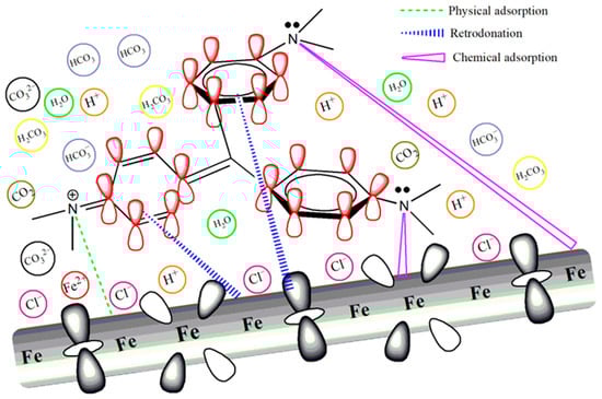 Despite the abundance of research focused on the corrosion inhibition properties of dyes, there has been relatively scant attention paid to a detailed examination of their underlying inhibition mechanisms [12]. Based on the experimental and theoretical calculation results, a possible adsorption mechanism for triphenylmethane dyes is proposed. The corrosive solution is saturated with carbon dioxide containing 5% NaCl, and it is rich in species such as H2O, HCO3−, CO2, H2CO3, and Cl− (Figure 11), which can severely corrode the surface of carbon steel. The anodic process involves the dissolution of Fe, while the cathodic process involves the reduction of H+ and H2CO3 [1,43]. Upon the addition of the dye, surface analysis through XPS and theoretical calculations suggests that the dye can adsorb onto the steel surface both physically and chemically. The inhibition mechanism encompasses a dual strategy involving both physical adsorption (through electrostatic attraction) and chemical adsorption (involving the sharing of electron density), as depicted in Figure 11. In the electrolyte solution, this orientation of negatively charged Cl− toward the solution interface promotes the physical adsorption of N+ in the dye molecule [51]. As for chemisorption, it is proposed that the inhibitors adhere to the surface through the interaction between the lone pairs of electrons on the N atom or the π-electrons from the aromatic benzene ring in the dye molecule with the unoccupied d-orbitals of iron atoms [28]. CV exhibits the best adsorption effect, attributed to its multiple electron-donating groups, which enhance the electron-donating capability of its benzene rings.