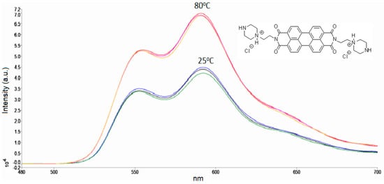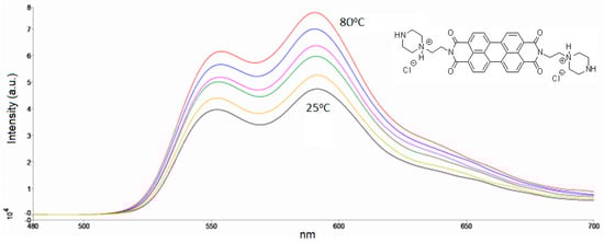 Although minor changes vs. temperature at 540 nm (UV–Vis) can be observed (Supporting Information, page S1, Figure S1), for AuNPs functionalized with PZPER, the amount of chromophore will likely be insufficient to observe a reliable response vs. temperature. Moreover, the plasmon resonance of gold nanoparticles will overlap the expected signal from PZPER. The problems with the gold background can be overcome by employing the fluorescence properties of PZPER. In this case, AuNPs cannot disturb the response of fluorescence probes to temperature. We examined the fluorescence of an aqueous solution of PZPER (Figure 1).