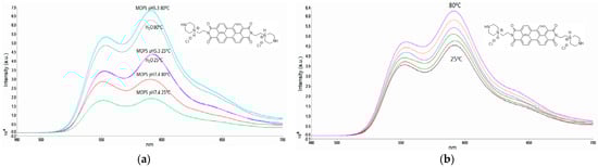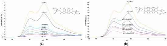 As presented in Figure 1, the changes in the intensity of emission at 590 nm can be related to the changes in temperature. However, every fluorescent probe must be tested for variables such as polarity, pH, viscosity, and molecular interactions before application in complex media/systems. We tested the fluorescence of PZPER in water and buffers (10 mM, pH 7.4), PBS, Tris, and MOPS at 25 and 80 °C. The results are summarized in Figure 2a.