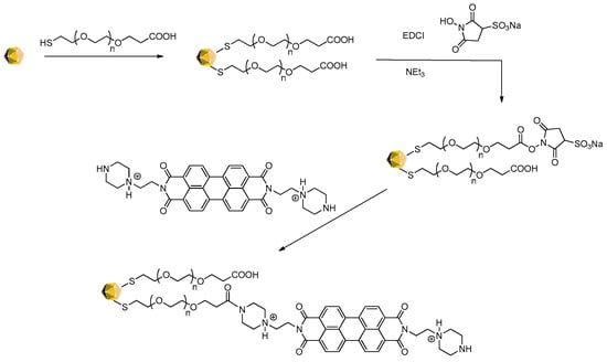 Gold nanoparticles (AuNPs, 12 nm) were stabilized with citric acid and functionalized with PEG 3000 thiol terminated with carboxylic groups. We decided to use this thiol to stabilize AuNPs and provide a relatively large distance between the gold surface and immobilized PZPER. In this way, we attempted to avoid the potential quenching of fluorescence by gold and obtain a more efficient excitation of the chromophore. Moreover, PEG units can improve the solubility of functionalized AuNPs in aqueous solution. The terminal carboxylic groups were activated with EDCI/N-hydroxysulfosuccinimide sodium salt and treated with PZPER. AuNPs were purified by an Amicon filter 50 kDa to remove side products and free PZPER. The synthesis of the functionalized AuNPs is presented in Figure 5.