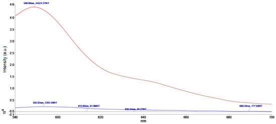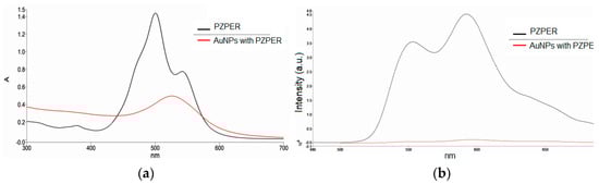 The spectra of PZPER were added for comparison (Figure 6 black line). For the UV–Vis spectrum, PZPER cannot be detected for functionalized AuNPs. The main problem is the strong SPR signal from gold nanoparticles (520 nm) and the low concentration of the attached PZPER. However, the fluorescence spectrum showed a weak signal at 590 nm, which can be detected due to the fluorescence lacking gold. The weak signal resulted from the quenching of fluorescence or the insufficient excitation of the chromophore limited by gold nanoparticles (Figure 6b).
