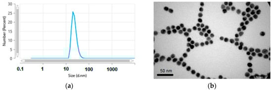 (a) DLS measurement of functionalized AuNPs, (b) TEM image of functionalized AuNPs.