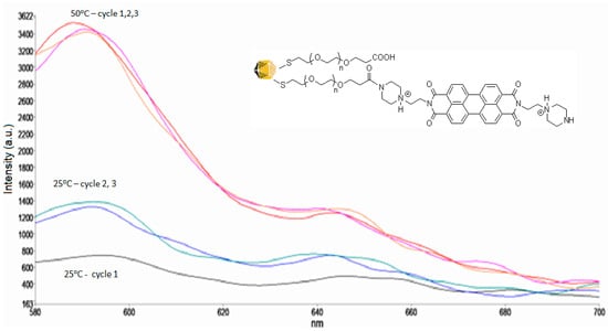 Fluorescence spectra of AuNPs (1 × 1012 NP/mL) functionalized with PZPER (λex = 532 nm) in MOPS buffer (1 mM, pH 5.35) at 25 (1 cycle (black), 2 cycle (green), 3 cycle (blue)) and 50 °C (1 cycle (orange), 2 cycle (purple), 3 cycle (red)) (three cycles).