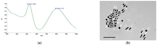 Gold nanorods (AuNRs, 8.8 × 39.8 nm) stabilized with BDAC and CTAB were obtained, as described previously []. The gold nanorod AuNRs were produced by seed-mediated growth method based on a CTAB-capped seed. The silver content of the growth solution was used to grow NRs to a desired length. The experimental procedure is provided in the Supporting Information (page S3).