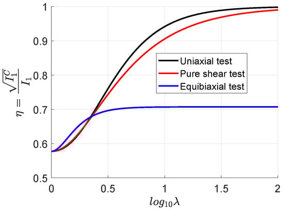 where stands for the first invariant of ; see Figure 1. At very large stretches, the following values are obtained.