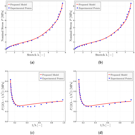 Predictions for the Treloar’s experimental data extracted from refs. [48,54]. (a) Treloar’s experiments in representation using the model proposed with the parameters MPa, MPa and . (b) Predictions in representation using the parameters MPa, MPa and . (c) Mooney space prediction with MPa, MPa and . (d) Mooney space prediction with MPa, MPa and .