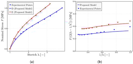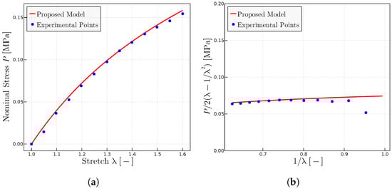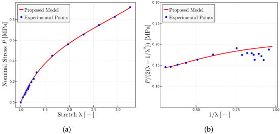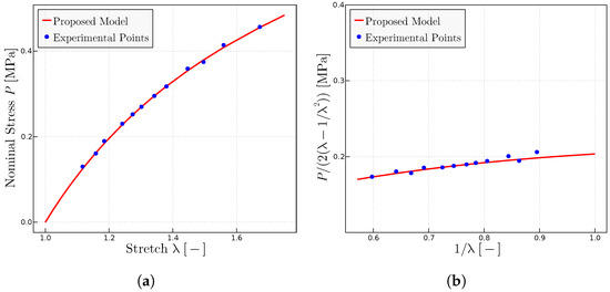 Experimental data extracted from Ref. [28]. (a) Uniaxial tests using the parameters = 1.925 MPa, = 0.115 MPa and = 7.5. (b) Mooney plots with the same parameters.