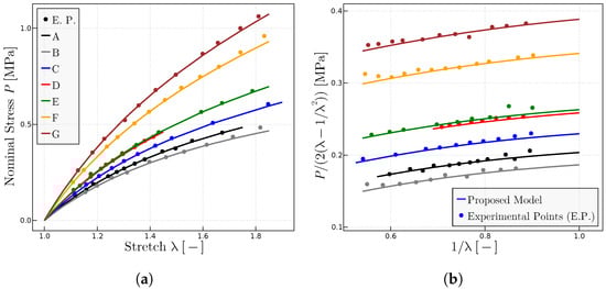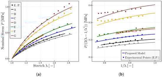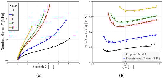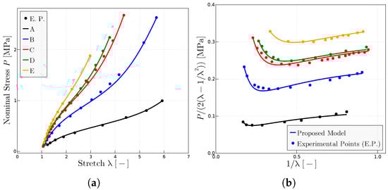 The proposed model has been used to characterize the behavior on dry samples of Ref. [27] with different concentrations of peroxide and, hence, different resulting degrees of cross-linking. Figure 6 shows the predictions of the model of the experimental points of both representations of the uniaxial test, the classical representation (Figure 6a) and the Mooney space representation (Figure 6b). The parameters obtained mainly from the Mooney plot are given in Table 3.