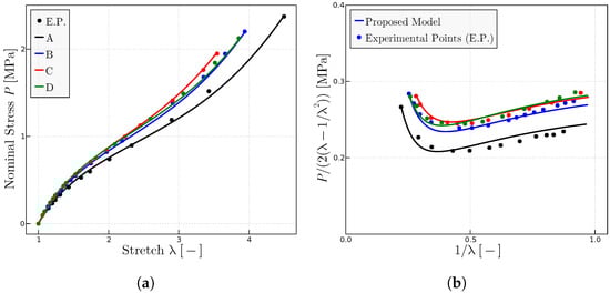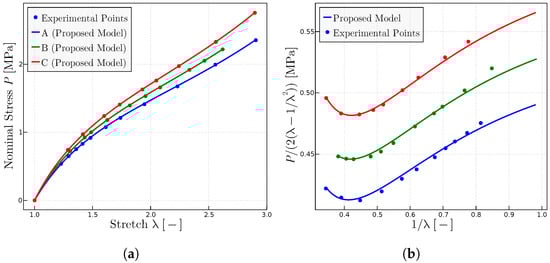 In this section, predictions for different materials under a variety of loading conditions are given. Experimental data for several tests have been obtained from several sources in the literature. Material parameters have been obtained using the previous approach, extracting and from the estimated y-intercept at and the overall slope in Mooney plots, and from the estimated locking stretch in , plots have been digitalized for this work. In several tests, we had to digitalize the stress–strain data from plots. Unfortunately, the errors in Mooney plots are magnified, which add to the more significative experimental errors at low stretches. Hence, sometimes, parameters have been refined from the adjustment to the resulting plot.