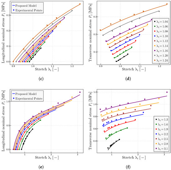 Prediction of the Kawabata et al. [55] biaxial experiments. (a) Extracted curve and predictions using the fitted parameters MPa, MPa and —for this stretches level, does not affect the results in a relevant manner. (b) Mooney space and prediction using the same parameters. (c) Longitudinal nominal stresses and (d) transverse nominal stresses as a function of the longitudinal stretch for a range of fixed small transverse stretches (1.04 to 1.24). (e) Longitudinal nominal stresses and (f) transverse nominal stresses as a function of the longitudinal stretch for a range of fixed large transverse stretches (1.3 to 3.1). All predictions are obtained with the same material parameters of MPa, MPa and .
