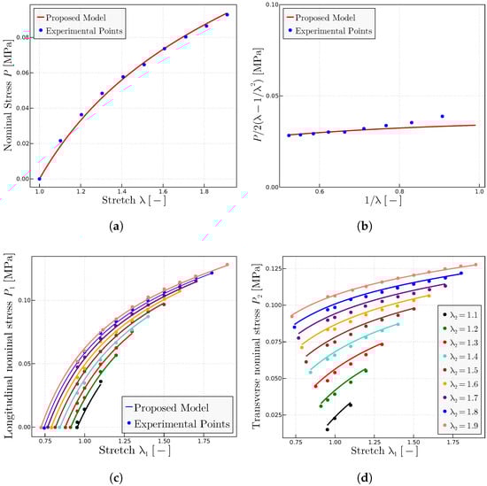 Predictions for the Kawamura et al. [56] biaxial experiments on weight solution. (a) Extracted uniaxial test in form and prediction using the fitted parameters MPa, MPa and —note that for this level of stretches, the value of is not relevant as long as it sufficiently large. (b) Mooney space representation of the tensile test and predictions. (c) Longitudinal nominal stresses and (d) transverse nominal stresses as a function of the longitudinal stretch for a range of fixed values of the transverse stretch . All predictions have been obtained with the same set of material parameters, i.e., MPa and MPa.