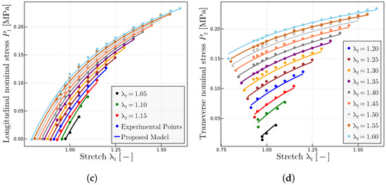 In this subsection, the model is used to predict the general biaxial experiments from Kawabata et al. [55]. These biaxial tests are the most general experiments in an incompressible isotropic material, because due to incompressibility, only two stretches are independent—say and —and only two stress values are given by the constitutive relation—say and ; the third stretch is given by the incompressibility constraint as and the pressure is given by external equilibrium, resulting in for plane tests. Hence, capturing both longitudinal and transverse stresses for all stretch combinations means that the general 3D behavior of the material has been captured. Whereas, to some extent, this has been achieved by other models, the callibration of the parameters for those models has been performed with several tests, so in essence, they just result in sophisticated interpolation schemes. In the present proposal, only a tensile test is used—Mooney and representations—to obtain the three parameters of the model (as one should expect in an isotropic, incompressible material) and, thereafter, predict all the test curves, both longitudinal and transverse.