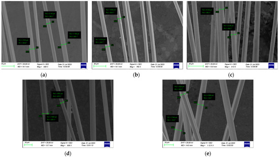 SEM images of recovered fibers ((a) for the Experiment #01, (b) for the Experiment #02, (c) for the Experiment #03, (d) for the Experiment #04, (e) for the Experiment #05).