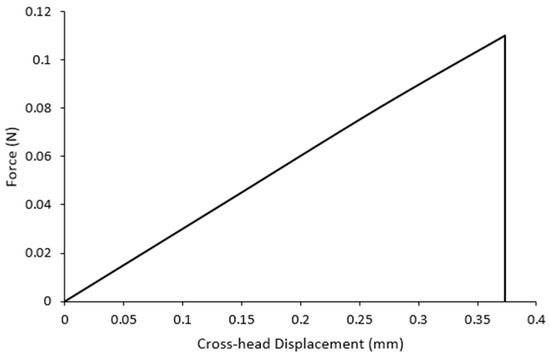 The constant cross-head displacement rate of the single-fiber tensile test was 2 mm/min, and the maximum possible strength at fracture was obtained within 30 s. A typical load–displacement curve of a single-fiber tension test conducted on a recovered carbon fiber is illustrated in Figure 6. As shown, the fiber exhibited linear tensile behavior.