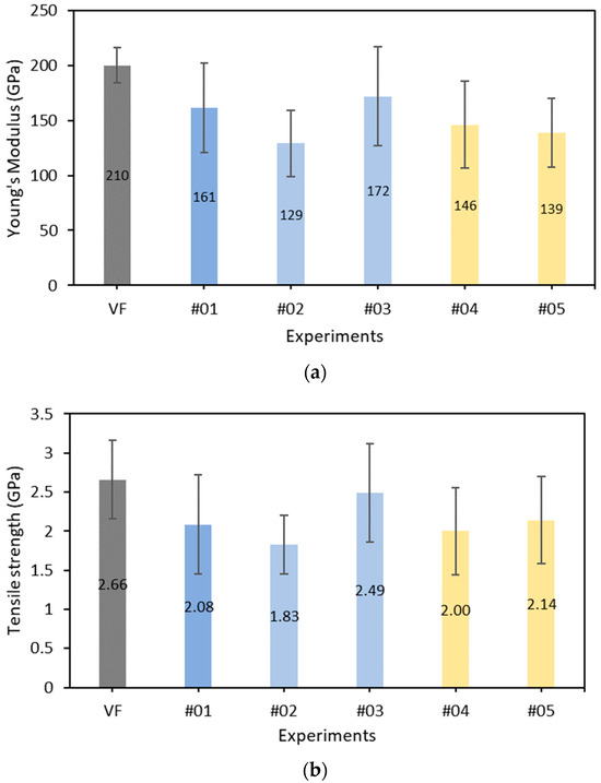 The derived Young’s modulus values of the different recovered CFs are presented in Figure 7a along with the standard deviation. The literature value for the virgin fibers is 210 GPa. A significant reduction in Young’s modulus of the CFs due to solvolysis varying from 18% for Experiment #03 to 38.6% for Experiment #02 is observed. The reduction varies with the solvolysis conditions.
