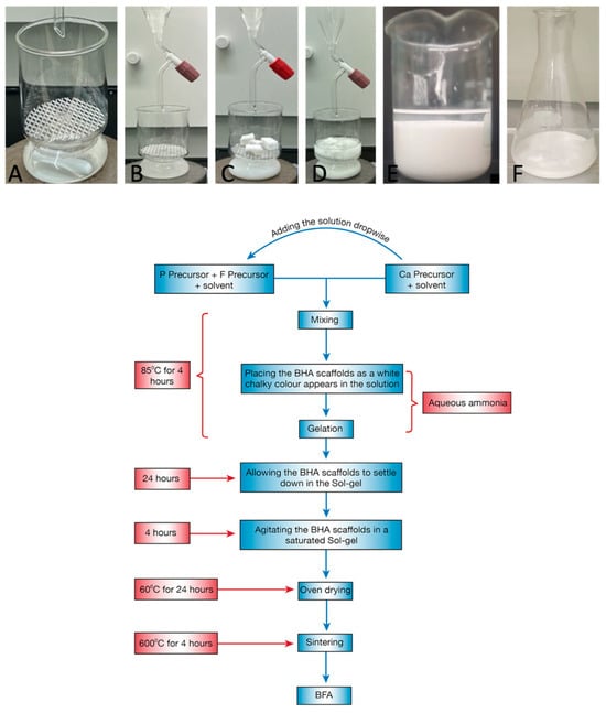 Controlled amounts of ammonium hydrogen phosphate ((NH4)2HPO4; Sigma Aldrich, Auckland, New Zealand) and ammonium fluoride (NH4F; Sigma Aldrich NZ) (Table 1) were first dissolved in de-ionised water with vigorous stirring for 15 min, and the phosphorus and fluoride (P-F) solution was transferred into a custom-made beaker (Figure 1A). The calcium solution was prepared by dissolving a stoichiometric amount of calcium nitrate tetrahydrate (Ca(NO3)2.4H2O; Sigma Aldrich NZ) (Table 1) in de-ionised water for 30 min with a magnetic stirrer. The calcium-containing solution was added dropwise to the P-F solution with the aid of a glass-dropping funnel (Figure 1B) until a white chalky colour appeared. Then 5–6 processed BHA cubes were placed immediately onto the wire mesh in the custom-made beaker (Figure 1C). The remaining Ca(NO3)2.4H2O solution was added dropwise directly onto the processed bovine bones under mild stirring/agitating conditions. To maintain a pH above 10.5 during the experiment, aqueous ammonia (Sigma Aldrich, NZ) was added to the solution. The combined solution was stirred for 4 h until the formation of a gel (Figure 1D), and the gel was allowed to settle for 23 h. The bone cubes were removed from the gel, and the solution containing the gel was transferred to a conical flask and allowed to settle for a further 2 h (Figure 1E). Once the gel was settled and supernatant was visible, the supernatant was removed and the bone cubes were placed in the saturated F sol-gel. An orbital shaker was used to agitate the bone cubes in the saturated sol-gel. Finally, the bone cubes were removed and dried in a domestic oven at 60 °C for 24 h prior to sintering at 300 °C for 4 h.