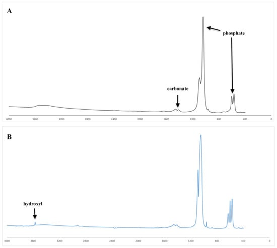 The FTIR spectra for BFA (A) and BHA (B) are presented in Figure 2. The FTIR spectra for both BHA and BFA samples showed characteristic phosphate and carbonate peaks associated with hydroxyapatite [7]. However, the hydroxyl peak due to lattice OH in the hydroxyapatite, which was observed at 3571 cm−1 in the BHA spectrum, was absent in the BFA spectrum.