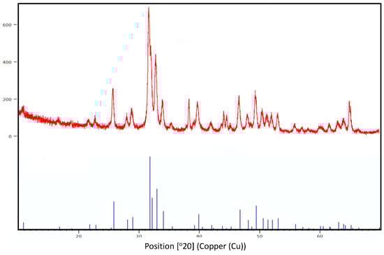 X-ray diffraction patterns of BFA (red) and JPDS pattern 01-080-3032 (blue) for fluorapatite.