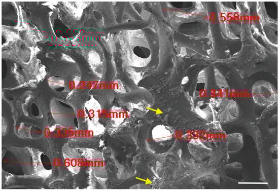 Scanning electron micrograph of the BFA scaffold. Pore sizes were measured (in red). Yellow arrows indicate the surface residues of the nano-particles deposited from the sol-gel process. Scale bar = 100 μm.
