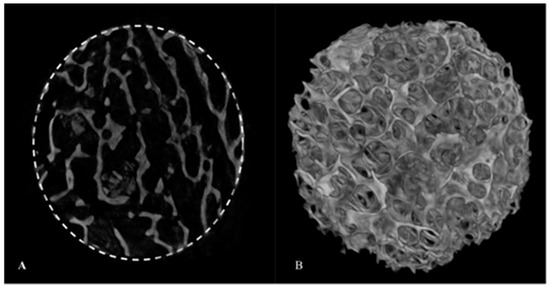 Micro-CT image of the BFA scaffold. (A) 2D cross-section of the BFA scaffold indicating the circular region of interest (dashed circle). (B) 3D image of the BFA scaffold.