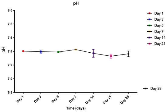 The pH of the SBF solution after soaking the BFA scaffolds is shown in Figure 8. The pH fluctuated between 7.3 and 7.4 during the investigated period of 28 days. No statistically significant difference in pH was observed when analysed using a 1-way ANOVA with Tukey’s multiple comparison test (ANOVA, p = 0.41).