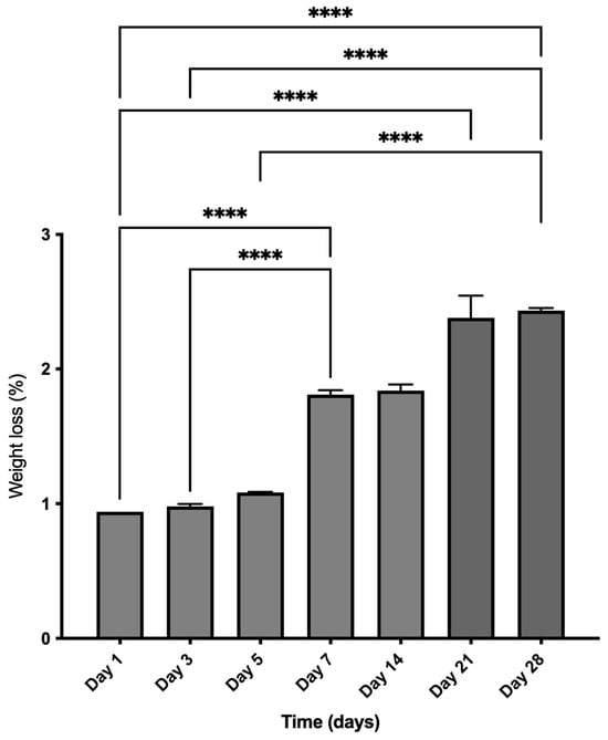 The BFA scaffold only showed minimum weight loss, losing ~2% until day 28. As shown in Figure 9, the BFA scaffold did not degrade significantly until day 5. However, following seven days, the weight loss significantly increased, peaking on day 28 (ANOVA, p < 0.0001).