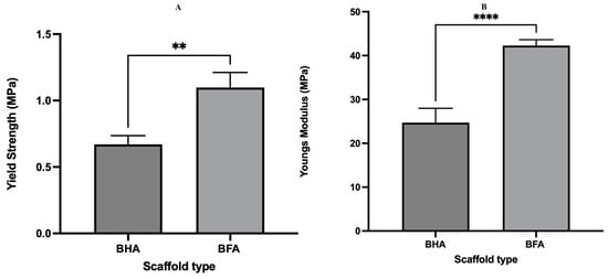 The mechanical properties of the BHA and BFA scaffolds are represented in Figure 10. A significant increase in the yield strength (t-test = 0.0064) and Young’s modulus (t-test < 0.0001) was observed for the BFA scaffold compared to the BHA scaffold.