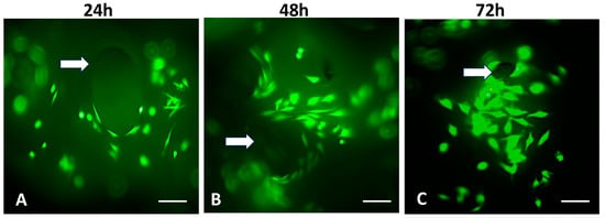 Fluorescent images illustrating the cell viability of Saos-2 cells seeded on the porous BFA scaffolds after undergoing the live/dead viability assay. White arrows represent the pores of the scaffolds (Green = live cells (calcein)). Red cells = dead cells (ethidium homodimer-1). 24 h (A), 48 h (B) and 72 h (C). Bar = 50 μm.