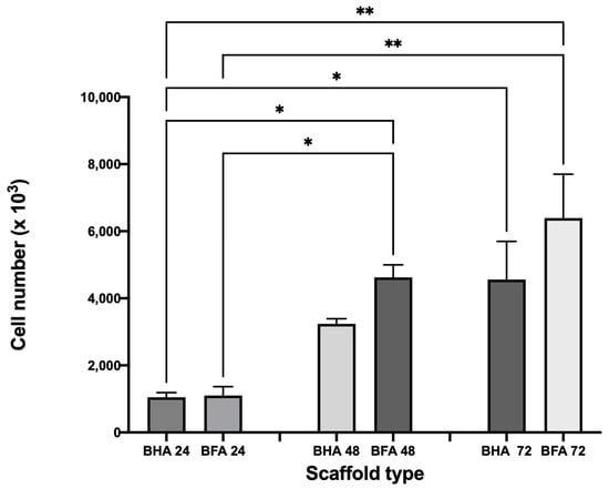 Graphical representation showing cell proliferation of Saos-2 cells after seeding onto the surface of BHA and bovine fluorapatite BFA after 24 h, 48 h and 72 h. Error bars represent the mean (±SEM) after 1-way ANOVA with Tukey’s multiple comparison test. * p < 0.05, ** p < 0.01. n = 3.