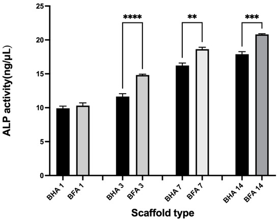Graphical representation showing the ALP activity of Saos-2 cells after seeding on BHA and BFA after 1, 3, 7 and 14 days. Error bars represent ±SE of the mean after 1-way ANOVA with Tukey’s multiple comparison test, ** p < 0.01, *** p < 0.001, **** p < 0.0001, n = 3.