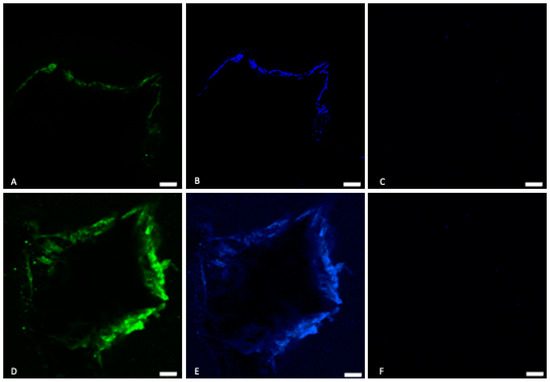 Immunofluoroscence analysis of osteonectin, on the BHA scaffold (A) and BFA scaffolds (D) After 14 days of culture. Nuclear staining/DAPI staining (blue) of the Saos-2 cells on the BHA scaffold (B) and SiBHA scaffold (E). (C,F) Control without primary antibody. Bar = 50 μm.