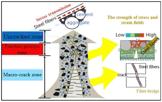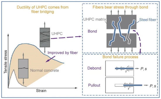 Concrete is a quasi-brittle material according to its macroscopic mechanical behavior. As its strength increases, its brittleness increases correspondingly, with the disadvantages of low tensile strength and minor ultimate elongation. To overcome these shortcomings, many researchers have incorporated steel fibers into concrete and have proven its feasibility [,,]. Steel fibers can improve the ductility of the cement matrix by bridging cracks, thus, improving the brittle fracture of concrete [,,]. Usually, adding steel fibers into concrete can play two main roles: (a) improving the tensile strength and (b) preventing the occurrence and propagation of cracks. Figure 1 shows that compared with normal concrete, the tensile strength and toughness of UHPC when steel fibers are added are significantly improved.