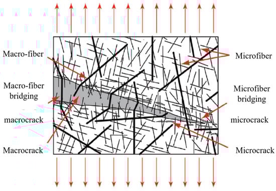 According to previous experience, steel fibers can be divided into micro steel fibers (/ ≤ 13/0.2) and macro steel fibers (/ > 13/0.2). Based on their length, they can also be divided into short steel fibers (6 mm < < 13 mm), medium–long steel fibers (13 mm ≤ ≤ 20 mm), long steel fibers (20 mm < < 30 mm), and ultra-long steel fibers (30 mm ≤ ). It is generally believed that a reasonable hybrid of two or more kinds of steel fibers can be added to a UHPC, which can not only play up the advantages of the different fibers, but also reflects their synergistic effect, which can significantly improve some properties of the UHPC, and reduce costs. Figure 3 shows the synergy between macro and micro steel fibers.