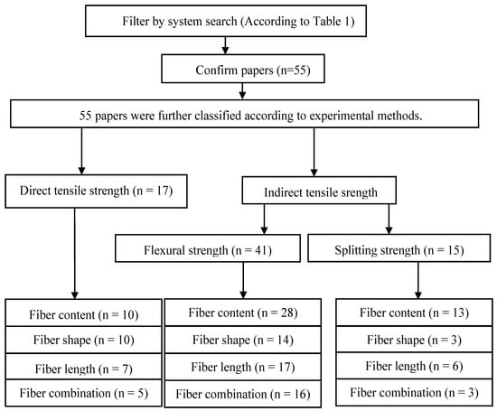 For the above problems, we identified three experimental methods, namely, the direct tensile test, flexural test, and splitting test, which are often used in UHPC tensile strength tests []. The relevant research papers were found through a systematic literature search of the “Web of Science”. Such databases are widely used in engineering research fields. Figure 4 shows the preliminary screening results of the papers that needed attention in this study based on “steel fiber”, “UHPC”, and “paper abstract”. The specific details are shown in Table 1. Finally, the collected papers are summarized in Table 2 according to the experimental methods and fiber properties. In the subsequent analysis, we classified the type and size of the specimens, and the loading methods and testing standards used in the different experimental methods to provide guidance for future tensile property testing of UHPC. At the same time, the first-cracking strength and tensile strength of the steel fibers added to the UHPC were considered. To more intuitively observe the effects of the fiber and specimen geometry, we extracted the tensile strength results for the UHPC for 28 days. The stress–strain curve of the direct tensile strength test and the load–deflection curve of the flexural strength test were further analyzed. In order to enrich the design model for UHPC, we summarized the empirical formulas and prediction models for the three experimental methods. In addition, DIC, as a new technique, has been widely used in the study of UHPC tensile crack growth. It is necessary to understand its application process to UHPC, which is of great significance for studying the tensile softening part of UHPC.