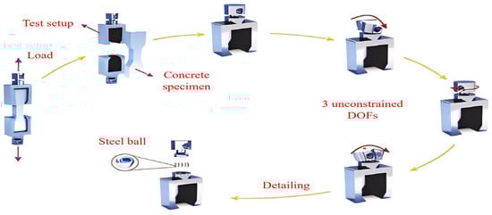 Use a testing machine with the appropriate range, pre-loaded to the force value of 60~100 N to ensure that the sample is not eccentric, and the elongation of the tensile sample is obtained by two LVDTs (Linear Variable Displacement Transducer) on the frame fixed in advance on both sides. Displacement control is commonly used during the loading process, and the displacement rate is 0.05~0.6 mm/min. The samples used for the direct tensile strength of the UHPC are dog-bone shaped and prism shaped, of which the dog-bone shape is the most commonly used, and most tests are not carried out according to the relevant standards (in Table 3) []. Some researchers refer to the testing methods of cement mortar standard AASHTOT 132–87 [], and common concrete standards GB/T50081-2019 [] and FHWA [], and some use the special standards for UHPC, such as JSCE [], T/CBMF37-2018 [], and NFP18-710 []. It is found that even the special standards for UHPC need to refer to the standards for ordinary concrete []. The number of researchers who have conducted direct tensile testing of UHPC has been limited by the difficulty of obtaining a uniformly distributed stress and a stable crack opening response across the cross section of the dog-bone specimens. However, the type of direct tension mode also has a large influence on the experimental results. Usually, pinned-end conditions are beneficial for specimen alignment and uniform stress distribution before cracks, but compared with fixed boundary conditions, it does not support uniform crack opening in the whole cross section []. Figure 5 shows that the tensile test method only constrains the axial degree of freedom.