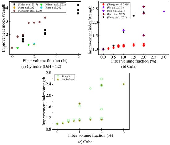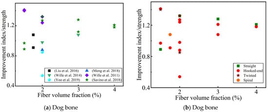 The effect of the fiber content and shape on the improvement index of the direct tensile strength. (a,b) Sorted by Ref. and fiber shape, respectively [,,,,,].