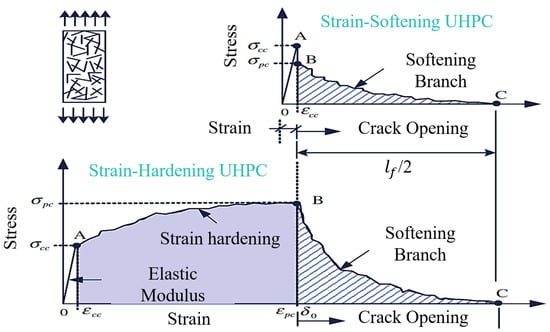 When the steel fiber content is greater than a certain critical value (), the direct tensile strength () of the UHPC is greater than the first-cracking strength (), and the UHPC exhibits “strain hardening behavior”; otherwise, it is “strain softening behavior” (Figure 8). The strain-hardening behavior of UHPC can be described in three parts: (a) The elastic stage, whose strength reaches 90~95% of the first-cracking strength, is when crack development and activation occurs. (b) In the strain-hardening stage, the matrix gradually cracks. The cracked part is mainly supported by the steel fibers, which are then transferred to the uncracked matrix. At this stage, there are numerous cracks. (c) In the strain-softening stage, the steel fibers are gradually pulled out to form a larger main crack. For “strain softening behavior”, there is no above-mentioned strain-hardening stage, only the elastic stage and the strain-softening stage. For the tensile stress–strain curve without an obvious first-cracking point, Park et al. [] determined the first-cracking point by fitting the intersection point of the elastic stage and the strain- hardening stage to reduce its subjectivity. Wille et al. [] thought that = 1 vol.%, while Le Hoang et al. [] and Kay et al. [] thought that ≈ 1.5 vol.%, the value of which can be predicted according to the principle of the mixing law []:
