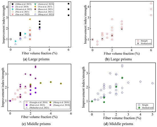 The effect of the fiber content and geometry on the improvement index of the first-cracking strength. (a,c) Sorted by Ref.; (b,d) sorted by fiber geometry [,,,,,,,,].