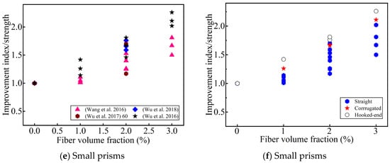 The effect of the fiber content and geometry on the improvement index of the flexural strength. (a,c,e) Sorted by Ref.; (b,d,f) sorted by fiber geometry [,,,,,,,,,,,,,,,,,,].