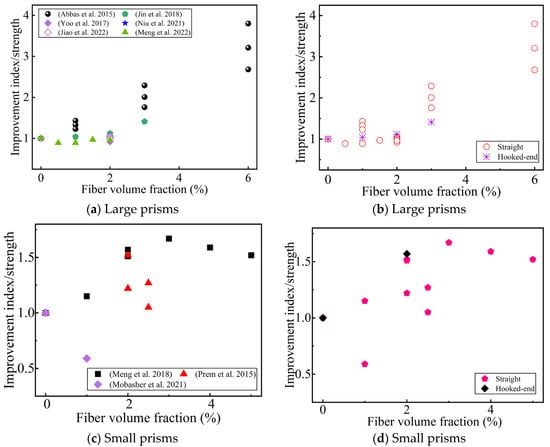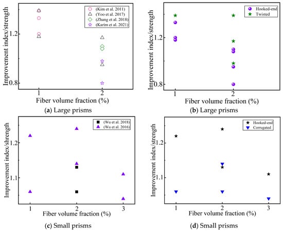 Figure 6a summarizes the influence of the steel fiber content on the improvement index of the direct tensile strength. All the studies agree that the direct tensile strength increases with an increase in the steel fiber content (up to 5 vol.% [,]), even reaching 3.2 times that of a UHPC without fiber reinforcement []. The size of the dog-bone specimen affects the improvement of the direct tensile strength by the fiber content [,,,]. The fiber content affects the strain-hardening phenomenon of the UHPC. Some researchers believe that the strain-hardening phenomenon occurs when the fiber content reaches 1.5 vol.% or above [,,]. However, Liu et al. [] studied a UHPC with a coarse aggregate, and found that even when the steel fiber content was as high as 2.5 vol.%, no strain-hardening phenomenon was observed in the matrix. This may have been because the addition of the coarse aggregate damaged the microstructure of the UHPC. When the fiber content is 2%, hooked-end steel fibers seem to improve the direct tensile strength better than straight steel fibers (in Figure 6b), which is related to the mechanical anchoring of the hooked-end steel fibers.