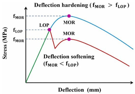Previous research has determined the load–deflection curve of UHPC, as shown in Figure 12. According to the rise and fall of the curve after the linear stage, it is divided into deflection-hardening behavior and deflection-softening behavior. The linear elastic turning point of the load–deflection curve is defined as the limit of proportionality (LOP) []. The nonlinear maximum point of the load–deflection curve is defined as the modulus of rupture (MOR). Some scholars have defined the maximum stress of flexural-softening behavior as the MOR []. Its constitutive model can be expressed by the following formula [,,]: