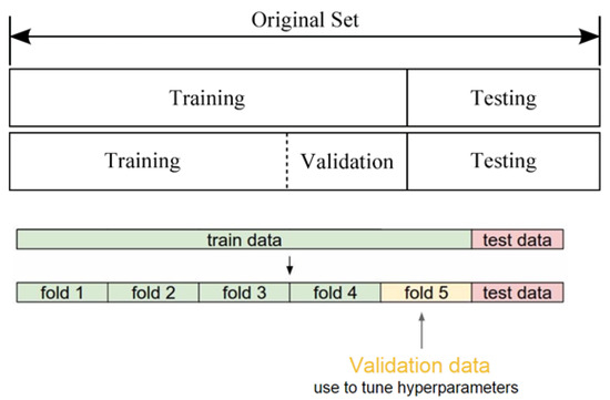 K-fold cross-validation was utilized in the present work as presented in Figure 1. The dataset was subdivided into K subsets which were independent of each other. Each subset was selected as a test set in turn, and the remaining K − 1 subsets were selected as a training set. The performance of the selected machine learning method was evaluated by obtaining the averaged prediction accuracies of the K tests [46]. The workflow of the present work is shown in Figure 2.