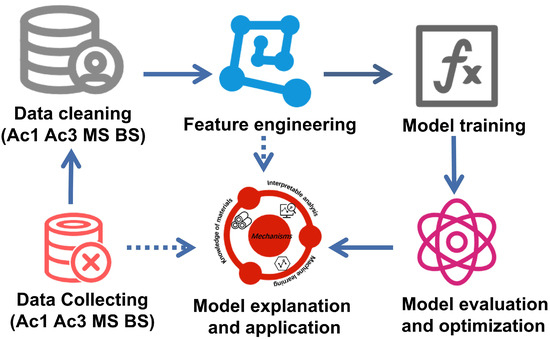 The microstructure and mechanical properties of steels depend on chemical composition, plastic deformation and heat treatment process [1,2,3,4,5,6]. Phase transformation start and finish temperatures in steels, marking the initial formation of the diverse microstructure, are crucial in designing steels with different targeted microstructures [7,8], such as martensite and bainite, as well as other advanced high-strength steels with complex microstructures, for example, medium manganese steels requiring inter-critical annealing [9,10,11,12]. The martensite transformation start (MS) temperature has attracted significant interest over the years because lath martensite is a base microstructure constituent for most high-strength steels [13]. Numerous methodologies, such as thermodynamics-based methods, linear regression, artificial neural network (ANN) modeling and machine learning, have been applied to predict the martensite transformation start (MS) temperature [14,15,16]. In the meantime, due to the virtues of bainitic steels, such as high strength, ductility, toughness and creep resistance at reasonable costs, the austenite-to-bainite transformation has also gained lots of interest [17]. Ac1 and Ac3 temperatures are the main parameters used to design the heat treatment process of steels. For example, medium Mn steel (3–12 wt. Mn%), as one of the various candidate steels for third-generation AHSS, typically consists of an ultrafine-grained dual-phase (austenite–ferrite) microstructure obtained through the inter-critical annealing (annealing between Ac1 and Ac3 temperature) of the quenched martensite matrix [18]. However, studies on the prediction of the BS temperature [19] and Ac1 and Ac3 temperatures [20] by means of machine learning are limited compared with those on the prediction of the MS temperature. Systematic and comparative studies on the influencing factors of the main phase transformation temperature in steels have not been reported. Meanwhile, most research has focused on the accuracy of trained models, but the focus on the training process and explanation of the trained models has been limited. This work aims to conduct in-depth research on these two concerns.