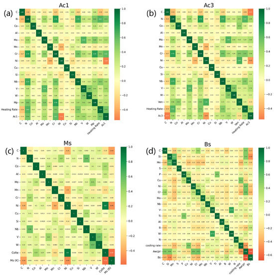 Feature correlation heatmap between the features and the specific phase transformation temperature. (a) Ac1, (b) Ac3, (c) MS and (d) BS.