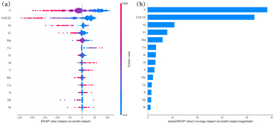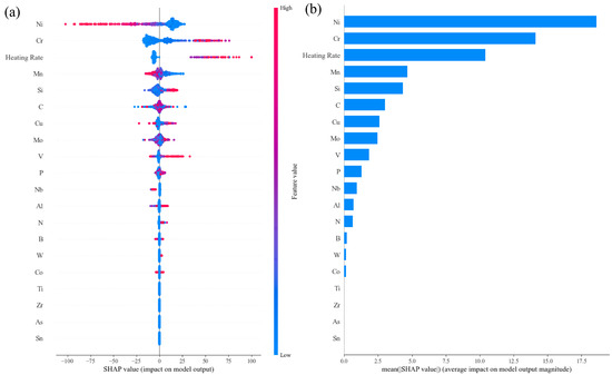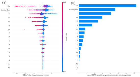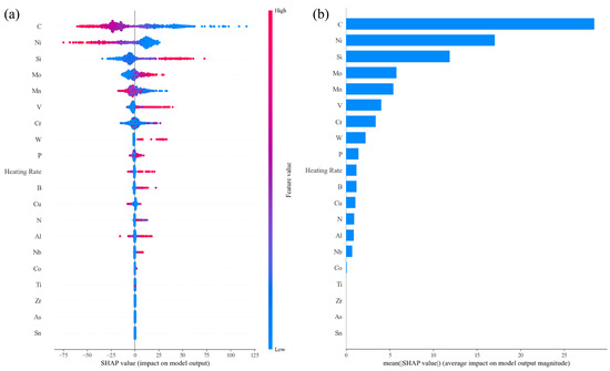 The incubation time was needed for bainite transformation as characterized by its time–temperature–transformation curves. Therefore, cooling rate outperformed other features in the feature importance ranking during the training, as shown in Figure 6d. Figure 10a clearly shows that the higher the C, Mn, Cr, Ni, Si, Mo, V, P and S contents and cooling rates, the lower the SHAP values (negative), i.e., the lower the BS temperature; the higher the Al, Ti and N contents, the higher the SHAP values (positive), i.e., the higher the BS temperature; Mn, Cu and B demonstrated more complicated effects on the MS temperature. The difference in the effects of alloying elements on the MS and BS temperatures indicated the diverse phase transformation mechanisms between martensite and bainite transformations. Meanwhile, the atomic Waber–Crome pseudopotential radius outperforms the atomic radius and the coefficient of linear thermal expansion in improving the performance of the BS prediction model, which indicated that the motion of the alloying element ion and the interaction between the alloying element ion and the surrounding electrons played an important role in bainite transformation and then the BS transformation could be better classified into reconstructive phase transformation.