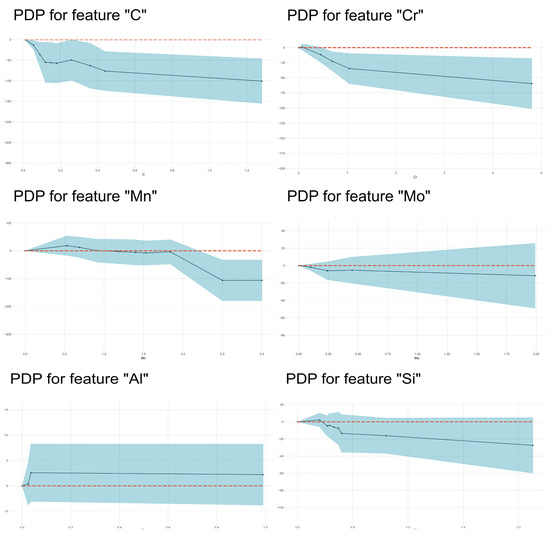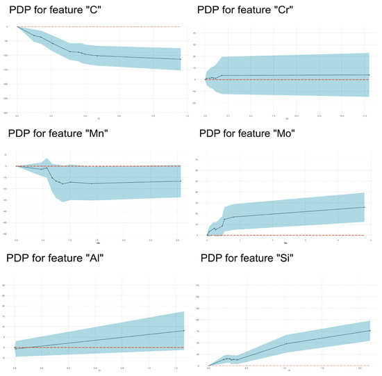 Interpretability is crucial in understanding the trained models by means of machine learning methods [41]. In this work, PDP and SHAP were used to explore the relationships between the features and phase transformation temperatures. Partial dependence plots (PDP) describe the marginal influence of one or two features on the prediction outcome of a trained machine learning model: