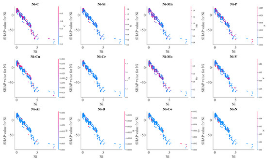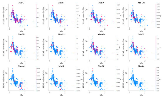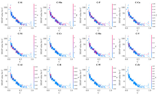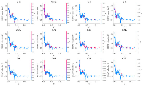 Figure 12 illustrates the effects of the interaction between C and other alloying elements on SHAP values. Generally, SHAP values decreased with C content. However, due to the interaction with other alloying elements, scattering in SHAP values occurred at each carbon content. Mn, Mo, V, Al, Cr and B exhibited an obvious influence on the effects of carbon on BS temperature. At lower carbon contents, SHAP values of carbon increased with Mn, Al and B contents, and SHAP values of carbon decreased with increasing Mo and V contents at the higher carbon contents. Meanwhile, increasing S and P somehow decreased the SHAP values of carbon. These results indicated that Mn, Al and B decrease the lowering effects of C on the BS temperature, and Mo and V as well as S and P enhanced the lowering effects of C on the BS temperature. C–Cr interaction demonstrated a complicated influence on the BS temperature. At lower carbon content, C–Cr interaction decreased the BS temperature; at higher carbon content, C–Cr interaction increased the BS temperature. At high carbon content, C–Mn interaction tended to decrease the BS temperature. C–Si interaction slightly increased the BS temperature.